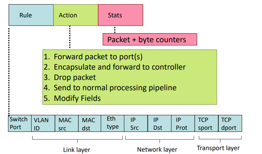 - 2. Action : 여러 포트들 가운데 특정 포트로 포워딩, 캡슐화, drop, 경로에 따른 패킷 전달 등의 정보가 들어간다.
