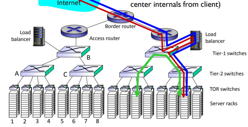 데이터 센터는 호스트들 간 상호연결 및 데이터 센터와 인터넷 간 상호연결을 위해 자체 데이터 센터 네트워크를 갖고 있다.