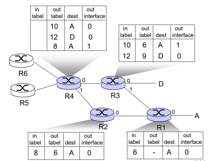 - 2. R3은 자신이 목적지 A,D까지 라우팅할 수 있고, MPLS 레이블 10, 12를 포함하는 입력 프레임을 각각 이들 목적지를 향해 스위칭할 수 있음을 라우터 R4에게 광고한다.