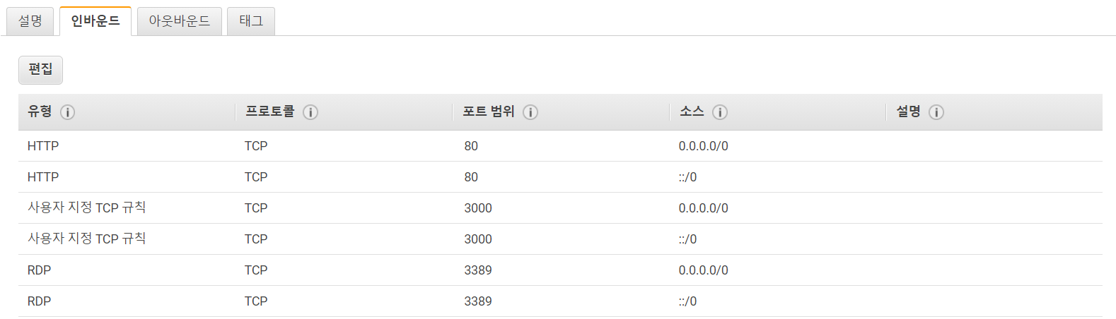 나는 기본적으로있는 RDP 이외에 (RDP는 인스턴스 접근 시 원격으로 접근하니까 당연히 있어야 함!)