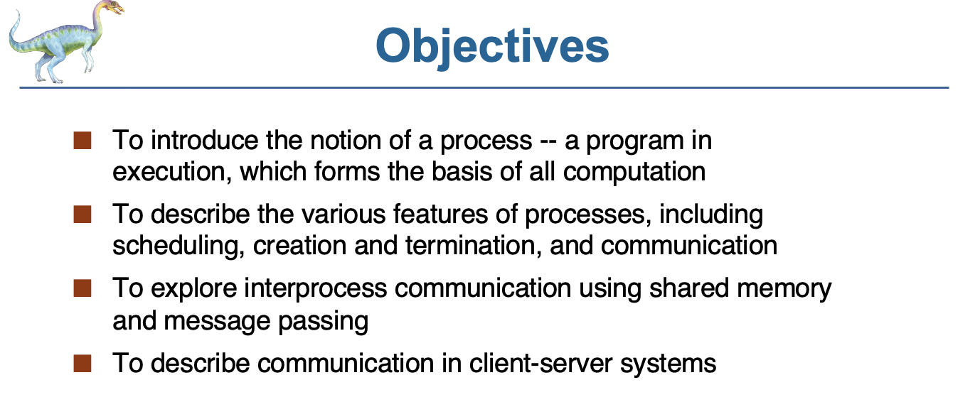 오늘날 컴퓨터 시스템들은 메모리에 다수의 프로그램을 제어하고, 구획화할 것을 필요로 한다. 이러한 필요성은 프로세스의 개념을 만들었고, 프로세스란 실행 중인 프로그램을 말한다.