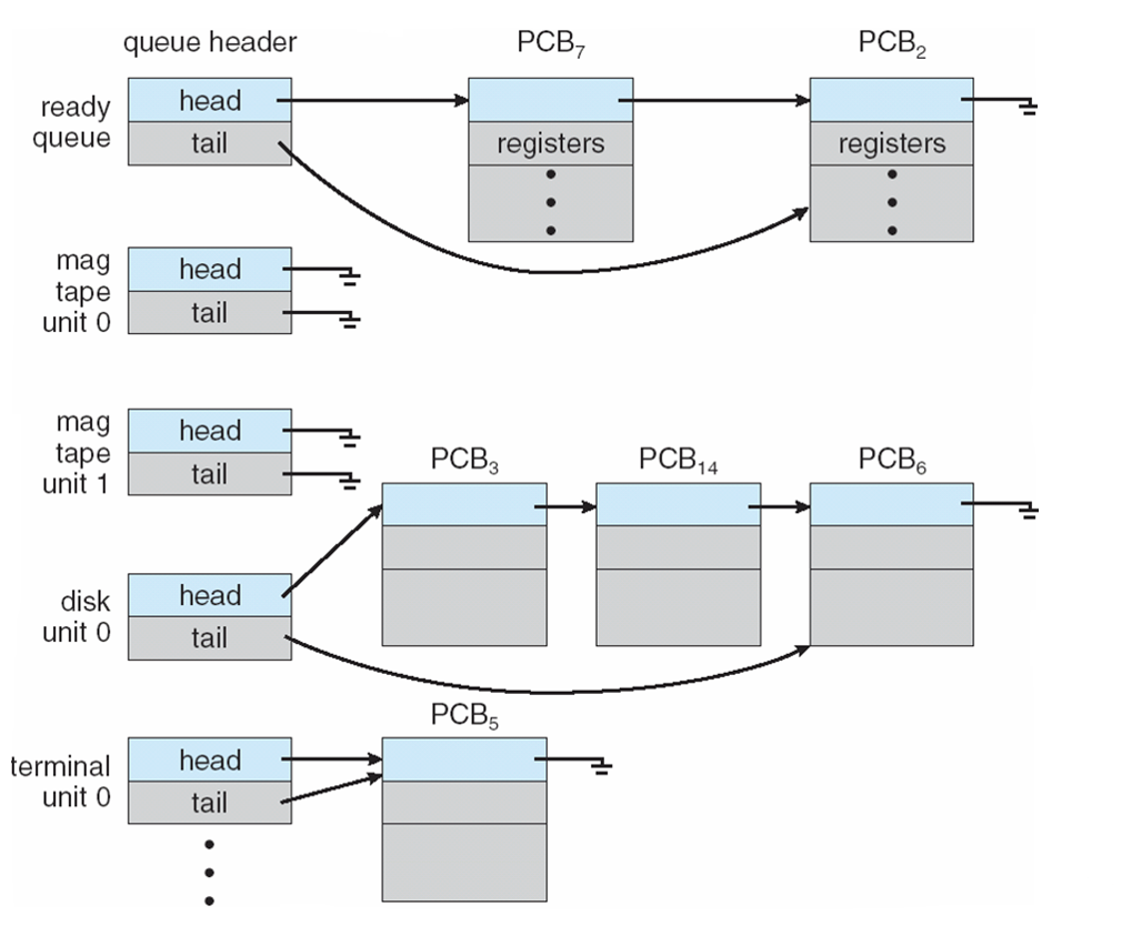 시스템에는 다른 큐도 존재한다. 프로세스에 CPU 코어가 할당되면 프로세스는 잠시 동안 실행되어 결국 종료되거나, 인터럽트 되거나, I/O 요청의 완료와 같은 특정 이벤트가 발생할 때까지 기다린다. 이런 프로세스들은 대기 큐(wait queue)에 삽입된다.