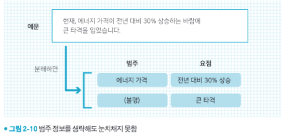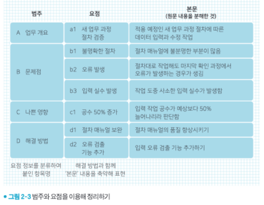 책에서는 요약을 위한 방법론으로, 범주(category), 요점, 본문을 분류하는 방법을 제시한다.
