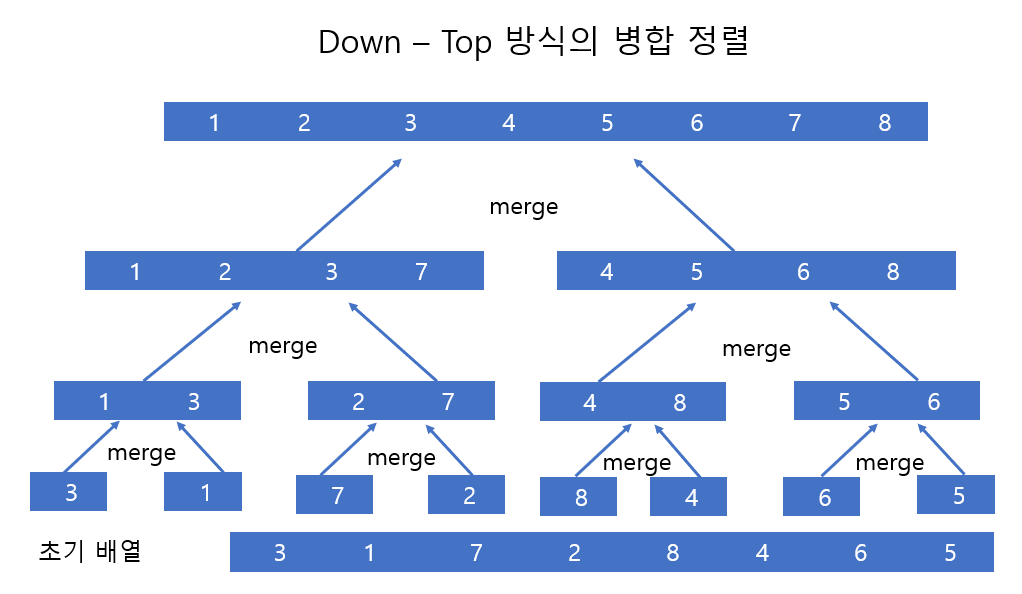 위 그림은 초기 배열 [3,1,7,2,8,4,6,5]를 밑에서 부터 위로 정렬하는 Down-Top 방식의 병합 정렬이다.