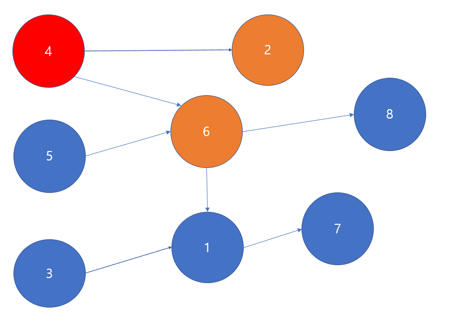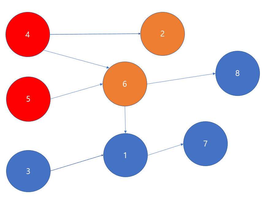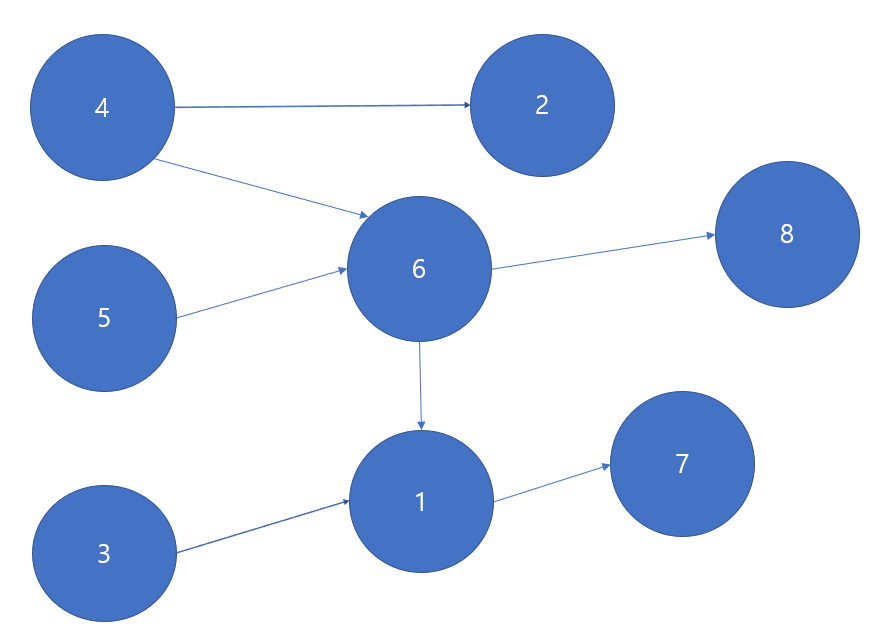 여기서 중요한건 위상 정렬을 사용하기 위해선 반드시 모든 간선이 한 방향을 향하고 있어야 한다는 점입니다.